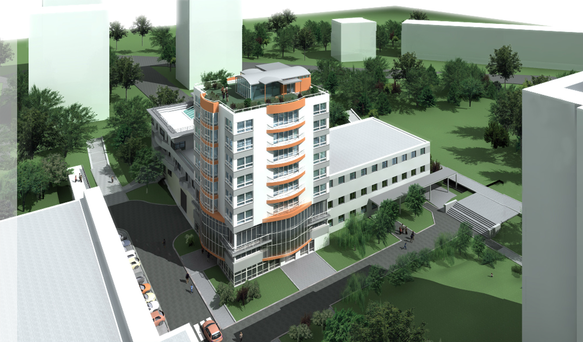 Umístění domu je vklíněno mezi stávající stavby na severu a západě, tomuto stavu je podmíněna dispozice v 1NP – 3NP. Hlavní vchod do domu je z ulice Trousilova. Vjezd a výjezd z podzemních garáží je navržen z ulice Trousilova v úrovni 1. NP. Z boční obslužné komunikace na východní straně je přístup do podzemního tepelného výměníku. Jedná se o polyfunkční dům s ubytováním pro seniory a v objektu jsou zajišťovány i související služby. V domě je umístěna jídelna s kuchyní veřejného stravování. Relaxační a rehabilitační služby, ordinace lékaře, společenský sál a rekreační terasa na střeše objektu.