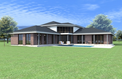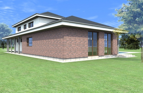 Studie – návrh stavby individuálního rodinného domu. Individuálně navržená vila má celkovou užitnou plochu včetně dvougaráže 403 m2. Kromě Obývacího pokoje s kuchyní, třech ložnic nechybí v dispozici domu pokoj pro hosty, relax místnost, sauna, párty místnost.
