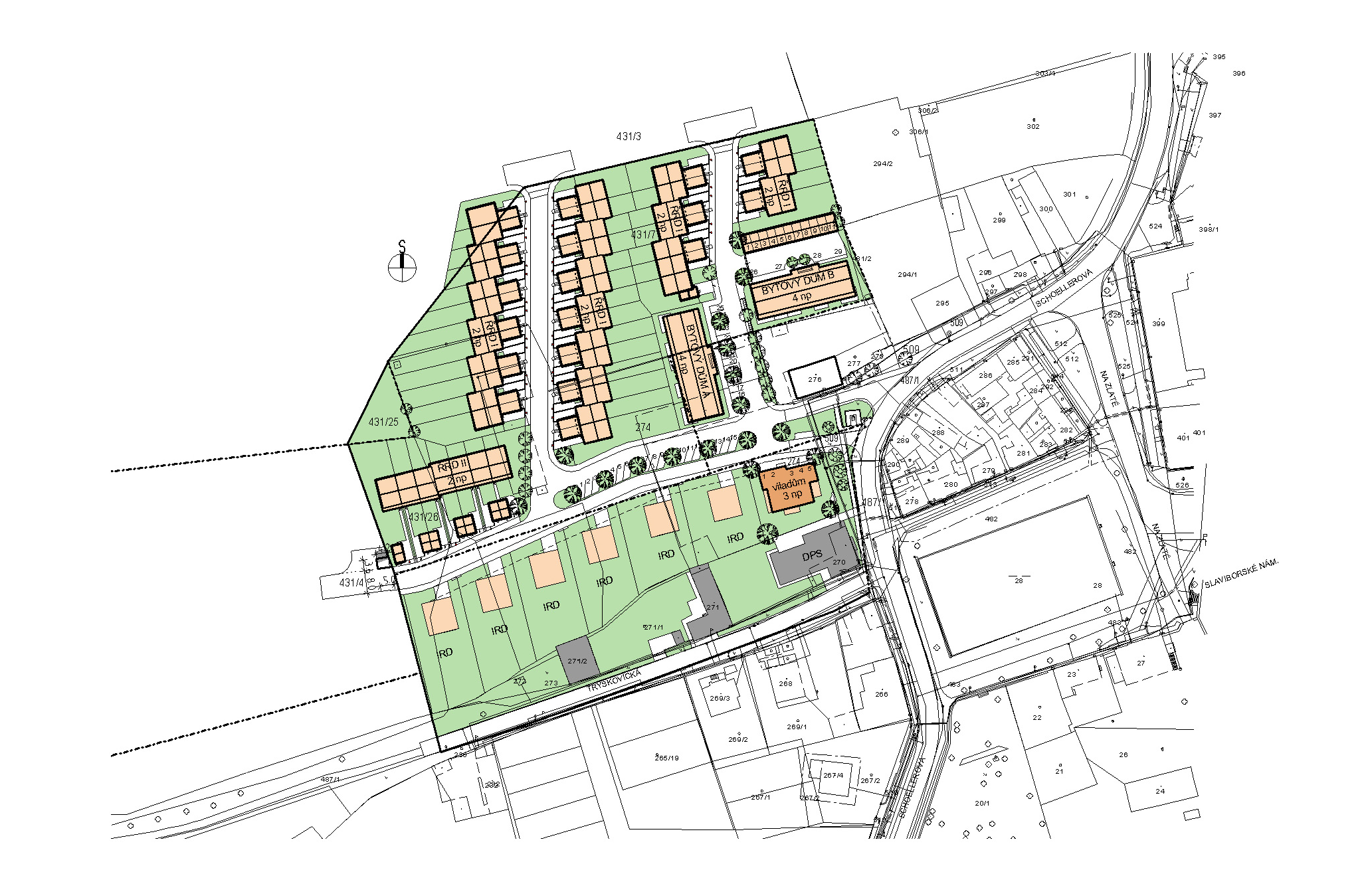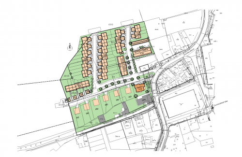 Řešení území, realizace 32 řadových domů, 2 bytových domů a 8 individuálních rodinných domů.